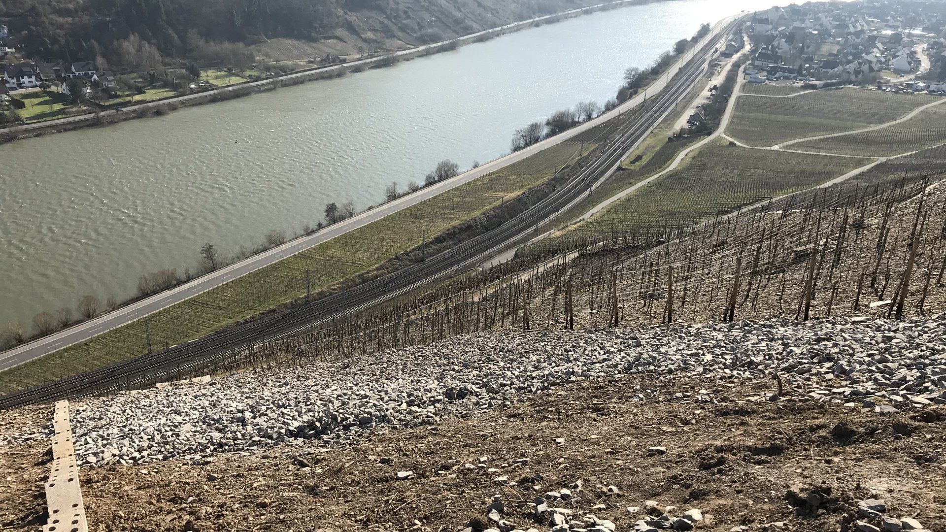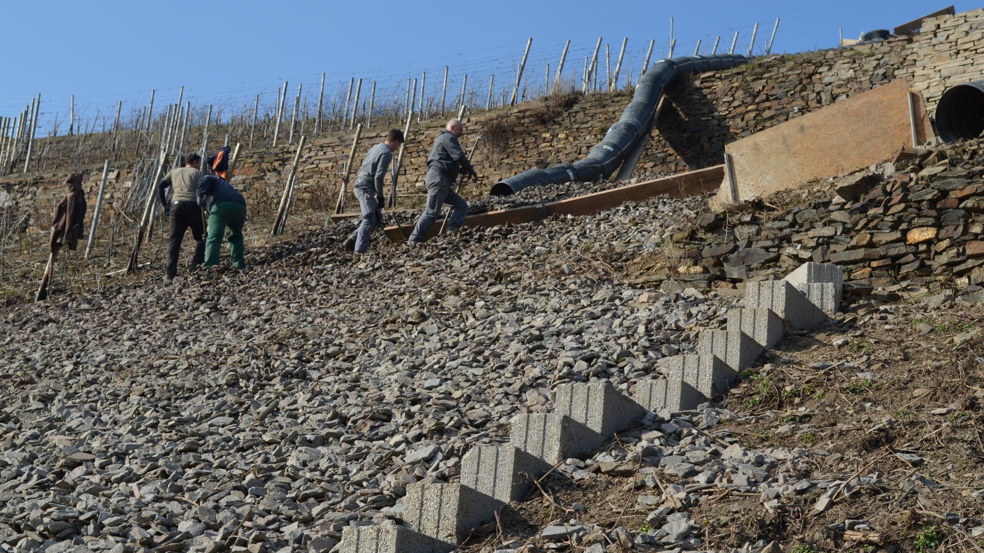Und heute? Wir geben unser Bestes, damit der über 2000 Jahre alte Begriff lebendig bleibt! In einigen Weinbergen, besonders im Uhlen, helfen uns die Wildschweine. Auf der Suche nach Eicheln in dem über den Terrassen gelegenen Wald befördern sie oft mehr Steine talwärts, als es uns lieb ist, und wir die Stöcke vor Steinschlag durch einen festen Zaun schützen müssen. Das andere Extrem sind Weinberge, die an einem Wirtschaftsweg enden. Hier ist der Kummer Mangelware oft im ganzen Weinberg. Glücklicherweise können wir hier mit einem LKW anfahren, die Steine (vorsichtig) abkippen und mit der Hacke talwärts ziehen. Bei den Mengen an Steinen und den vielen Stunden Arbeit hat es was von Sisyphus. Besonders, da es alle paar Jahre wiederholt werden muss. Aber nach mehr als 10 Jahren sehen wir hier und dort schon ganz akzeptable Ergebnisse. Ein größeres Erfolgserlebnis schenken uns Weinberge, die wir komplett neu pflanzen. Da müssen wir auf die Reben keine Rücksicht nehmen und können die Steine durch Röhren ins Tal donnern lassen. Beim letzten komplett gekümmerten Weinberg - siehe Fotos - haben wir pro 1000 m² unglaubliche 250 Tonnen Schotter ausgebracht! Zwei Wochen Arbeit - und ein Krach wie bei einem Erdbeben. Aber dann.... Wir haben den Weinberg 2018 gepflanzt, dem trockensten Jahr seit Langem. Und die Reben sind gewachsen! Langsam zwar, aber mit dunkelgrünen, gesunden Blättern. Der Kummer schützt den Boden nämlich nicht nur vor Erosion, er schützt ihn auch vor Verdunstung. Und zu guter Letzt ist Kummer der beste Schutz vor unangenehmem Bewuchs von Gras, Winde und Brombeeren. Zugegeben, zu Beginn macht das Laufen über den Schotter keinen großen Spaß. Aber da wir heute horizontal arbeiten ordnen sich die Steine in der Zeile nach einigen Jahren zu kleinen, recht bequemen Mikroterrassen. Die Steine verhaken sich und bleiben liegen. Ein Weinberg für 100 Jahre!