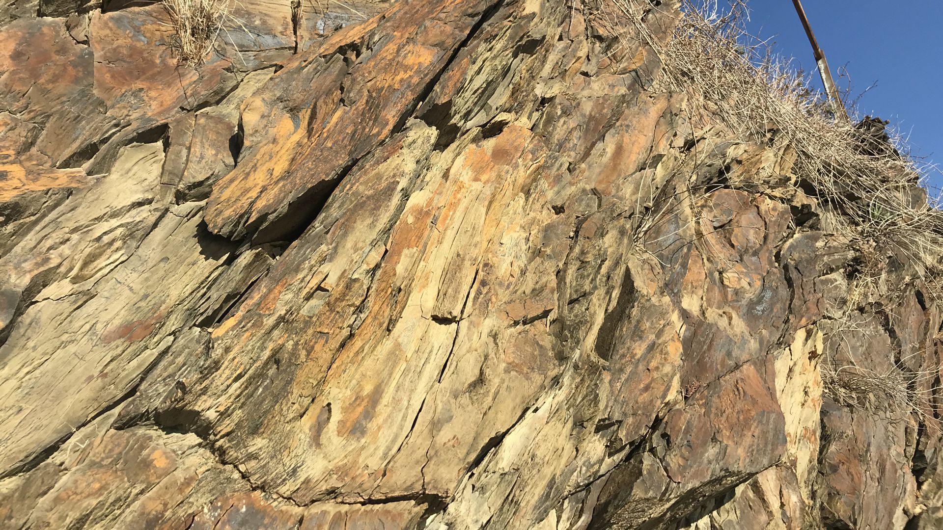 Geologische Definition: Devon, Rittersturz-Schichten. Blauer Schiefer, dessen Eisengehalt bei Luftkontakt aber so schnell oxidiert, dass optisch primär die gelb-braune Färbung der Oberfläche wahrgenommen wird. Und an besonders exponierten Stellen wird durch die Sonnenhitze sogar das Petroleum (vormals Plankton) aus dem Schiefer gekocht und liegt als blauer Schimmer über dem Fels.
