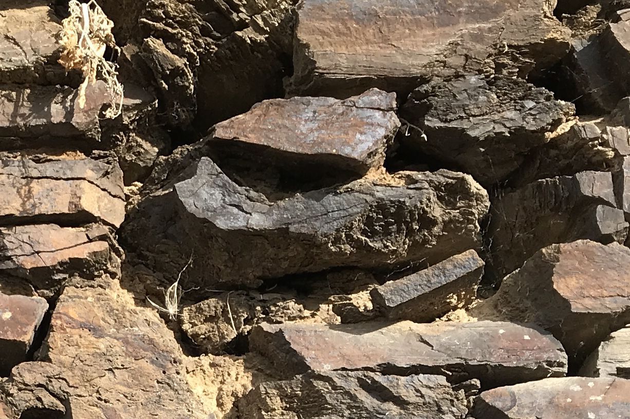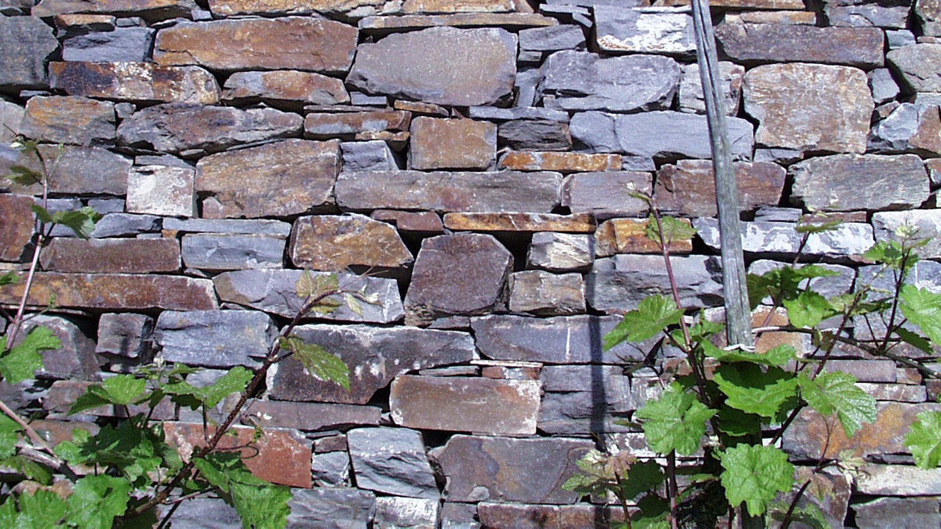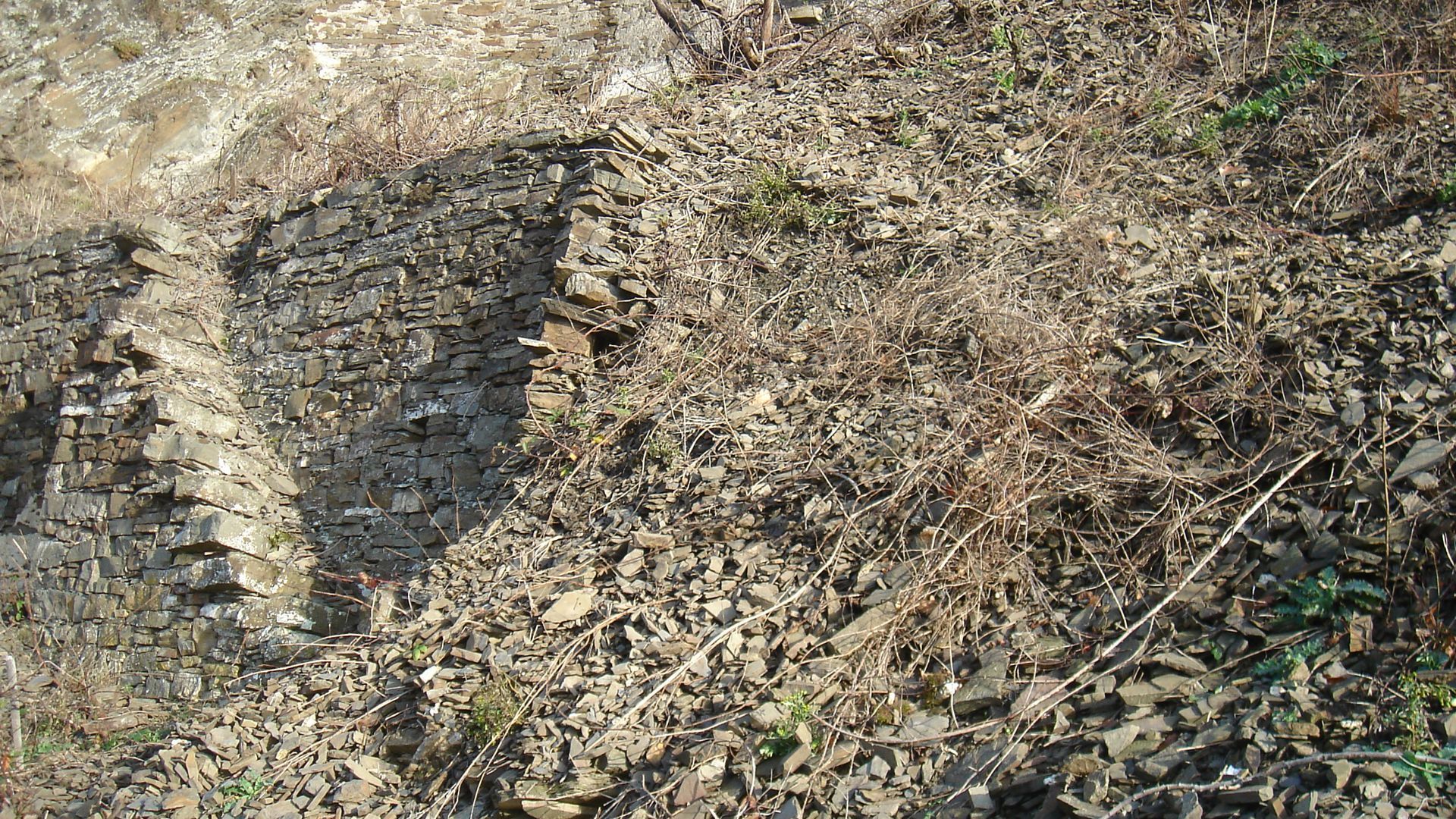 Genug geschimpft. Es gibt auch sehr viele wunderschöne Mauern. Und es gibt in Ministerien und Behörden engagierte Menschen, die sich für die Weinbergsmauern stark machen. Traditionell sind sie trocken, ohne Verwendung von Mörtel, aufgesetzt. Das hat den großen Vorteil, dass bergseitiges Wasser abfließen kann und dass Eidechsen, Schlingnattern & Co einen optimalen Lebensraum haben. Aber auch für die Haltbarkeit der Mauer selbst ist die Trockenbauweise von entscheidendem Vorteil. Mörtel verwittert schneller als Stein. Schon nach 100 Jahren sollte die Mauer daher Probleme bekommen. Wenn Stein auf Stein gelegt wird, und zwar so, dass mit kleinen Steinen so lange unterlegt wird, bis nichts mehr wackelt, korreliert die Lebensdauer einer Mauern mit der Härte des Schiefers. Bei sehr weichen Schiefern beträgt die Halbwertzeit ca. 200 Jahre, bei härteren Steinen mehr als das Doppelte. Natürlich nur, wenn kein größerer Bergrutsch entsteht und wenn beim Mauern selbst die essentiellen Regeln eingehalten werden: Keine senkrechten Fugen, keine waagerechten Fugen, die länger sind als 80 cm und eine Neigung gegen den Berg von ca. 3°. Die schöne Seite des Steins, das Gesicht, zeigt nach vorne und ist so verlegt, dass, falls nicht rechtwinklig gebrochen, die obere Kante weiter vorsteht, als die untere Kante.