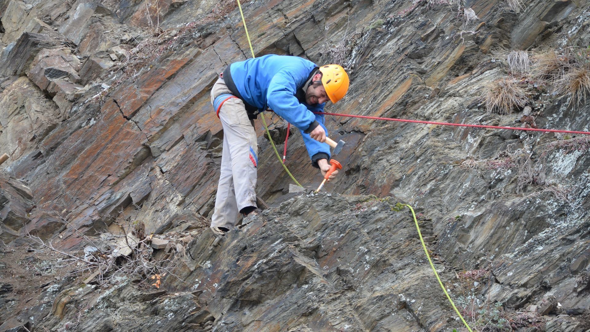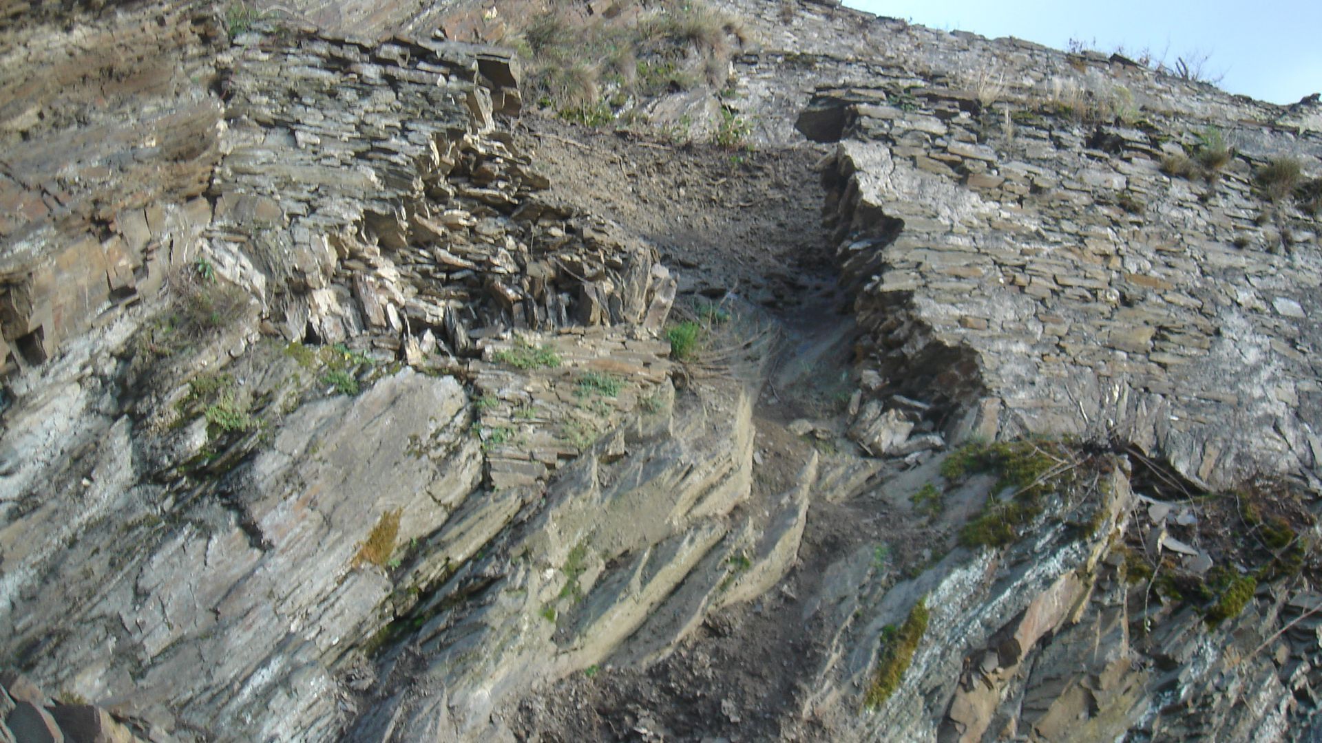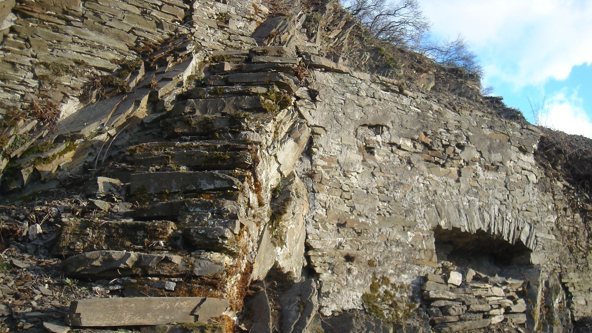 Genug geschimpft. Es gibt auch sehr viele wunderschöne Mauern. Und es gibt in Ministerien und Behörden engagierte Menschen, die sich für die Weinbergsmauern stark machen. Traditionell sind sie trocken, ohne Verwendung von Mörtel, aufgesetzt. Das hat den großen Vorteil, dass bergseitiges Wasser abfließen kann und dass Eidechsen, Schlingnattern & Co einen optimalen Lebensraum haben. Aber auch für die Haltbarkeit der Mauer selbst ist die Trockenbauweise von entscheidendem Vorteil. Mörtel verwittert schneller als Stein. Schon nach 100 Jahren sollte die Mauer daher Probleme bekommen. Wenn Stein auf Stein gelegt wird, und zwar so, dass mit kleinen Steinen so lange unterlegt wird, bis nichts mehr wackelt, korreliert die Lebensdauer einer Mauern mit der Härte des Schiefers. Bei sehr weichen Schiefern beträgt die Halbwertzeit ca. 200 Jahre, bei härteren Steinen mehr als das Doppelte. Natürlich nur, wenn kein größerer Bergrutsch entsteht und wenn beim Mauern selbst die essentiellen Regeln eingehalten werden: Keine senkrechten Fugen, keine waagerechten Fugen, die länger sind als 80 cm und eine Neigung gegen den Berg von ca. 3°. Die schöne Seite des Steins, das Gesicht, zeigt nach vorne und ist so verlegt, dass, falls nicht rechtwinklig gebrochen, die obere Kante weiter vorsteht, als die untere Kante.