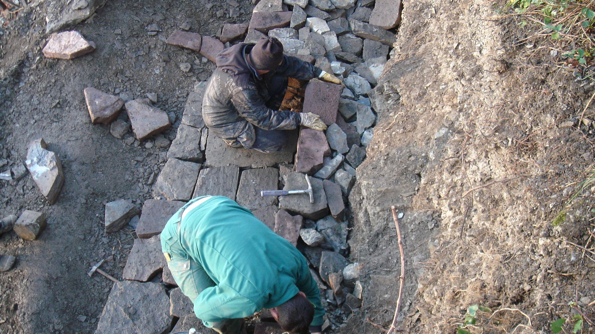 Eigentlich ganz einfach. Aber es dauert schon eine Weile, bis sich eine tiefere Beziehung zwischen Maurer und Stein entwickelt. Wohin und wie fest muss ich mit meinem Hammer zuschlagen, damit die störende Ecke abbricht und nicht der ganze Stein zertrümmert ist? Und mit welchem Blick muss mich der Stein anlachen, damit er in die vorgesehene Lücke auch genau hineinpasst?