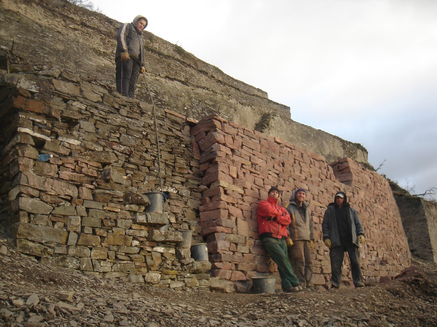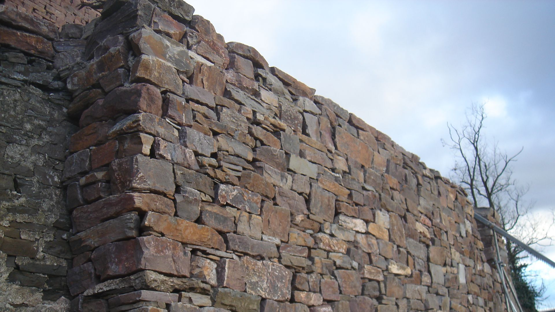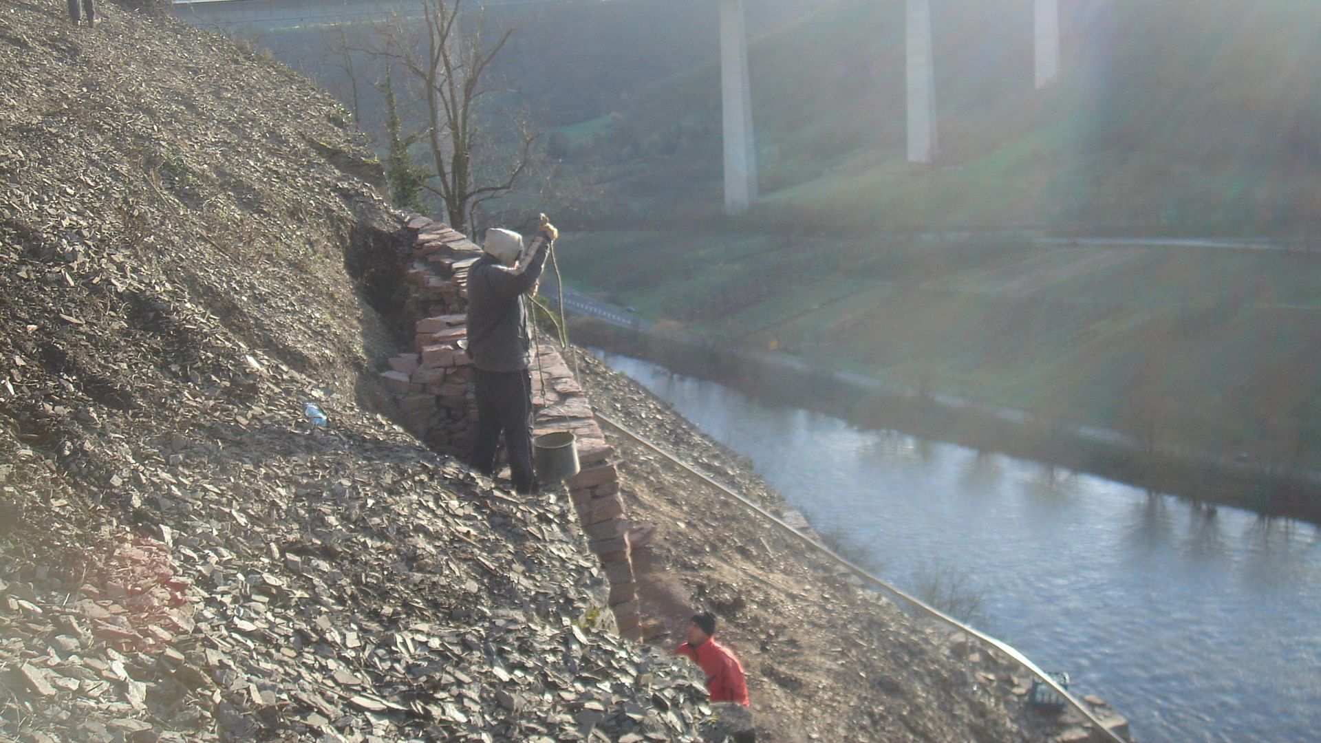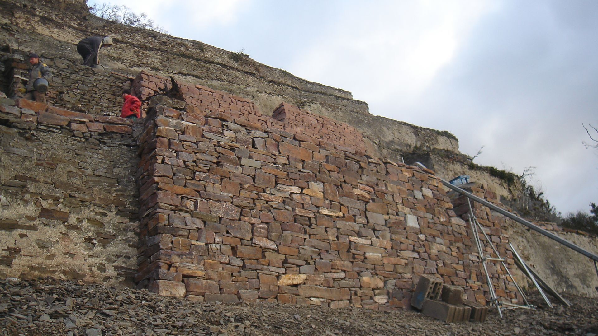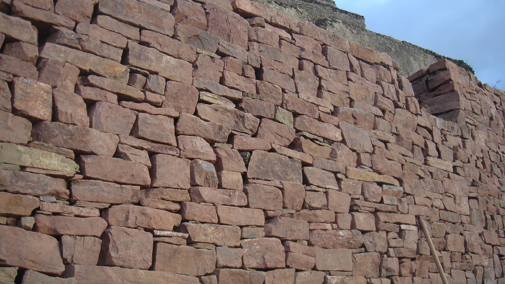 Parallel mit der Mauer wächst die sogenannte Hintermauer aus kleineren und weniger schönen Steinen. Sie ist essentiell für die Statik, da es bei dieser Art von Mauern auf Kompaktheit und Gewicht ankommt. Um die beiden Mauern miteinander zu verbinden muss ab und zu ein sogenannter Riegel verlegt werden. Ein schmaler, langer Steil der in Richtung Berg zeigt.